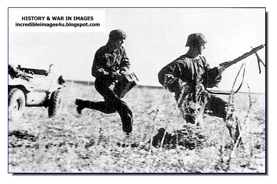 Location: Outskirts of Gostischevo. SS men jump from their amphibious (Schwimmwagen), to set up the machine gun MG-42 in firing position.The second is carrying two boxes of ammunition, each containing 250 rounds.