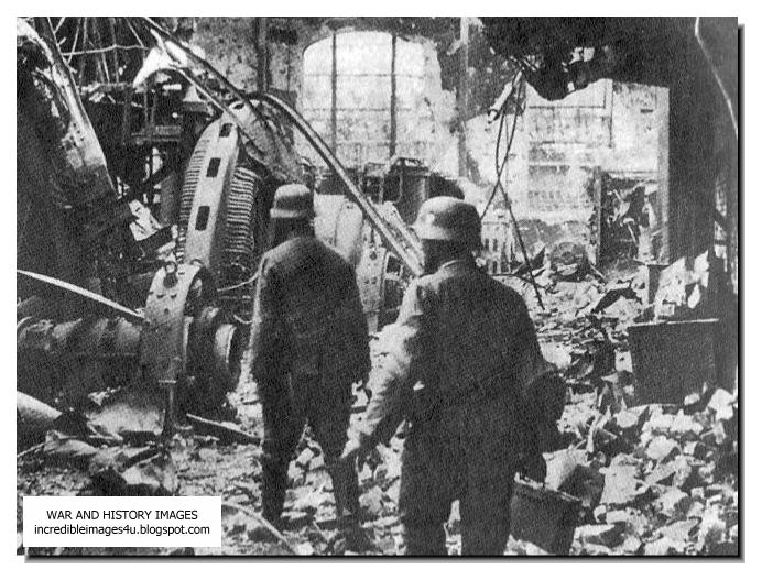 Germans moving through the ruins of a factory