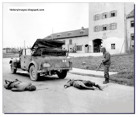 American soldiers have just shot dead two SS men riding a German staff car at the SS concentration camp in front of the Murnau. April 29, 1945. The German staff car hit a convoy of armored vehicles of the 12th Armored Division, United States Army. The dead Germans are Brigadeführer SS Fick Ernst (Ernst Fick), and to his right - his driver. Photo taken: 04/29/1945 Location: Murnau, Germany