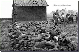 An US soldier stands besides the bodies of 36 Belgian women and 22 children who were allegedly murdered by the men of the German Waffen SS Divisions Adolph Hitler and Hohenstaufen.