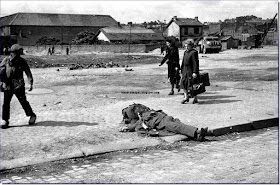 Two Frenchwomen walk pass a dead German soldier in Cherbourg France. 1944