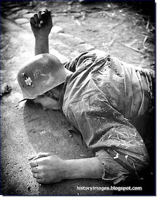 American soldiers shot by a German sniper in the town of Koblenz, Germany, was left lying with a gun and a grenade in his hand, in March 1945.