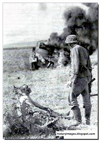 A Russian soldier who managed to escape from his tank looks helplessly at his captor. June 24, 1941. The Russian POW either starved to death or were used as slave labor in Germany.