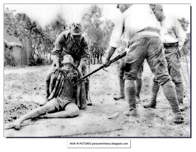 A Chinese POW about to be beheaded by a Japanese officer with a shin gunto during the Nanking Massacre.